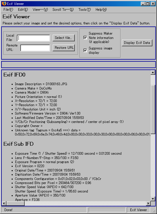 Firefox拡張機能「Exif Viewer」で見たD904iで撮影した画像のExif情報