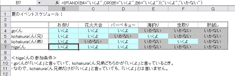 =IF(AND(C4="いくよ",OR(C5="いくよ",C6="いくよ")),"いくよ","いかない")