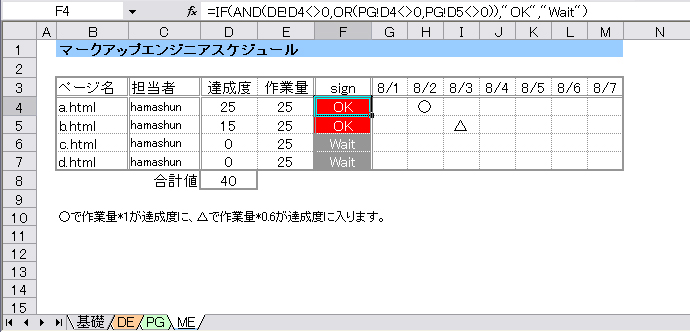となります。エンジニアさん(シート名 : PG)も同じつくりになっています。問題はデザインとプログラムが済まないと作業に入れないマークアップエンジニアさんのシート(シート名 : ME)です。