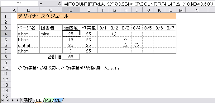 =IF(COUNTIF(E3:K3,"○")>0,$D3*1,IF(COUNTIF(E3:K3,"△")>0,$D3*0.6,0))