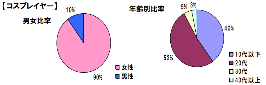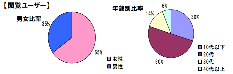 「閲覧会員」では、男性 35% に対し女性が 65% と女性比率が高い状態となっています。さらに、これが前述の「コスプレイヤー会員」になるともっと顕著になり、男性 10%、女性 90% と、ほぼ女性だけの構成となります。また年齢層も、10 代と 20 代で「閲覧会員」の 80%、「コスプレイヤー会員」の 90% を占めます。