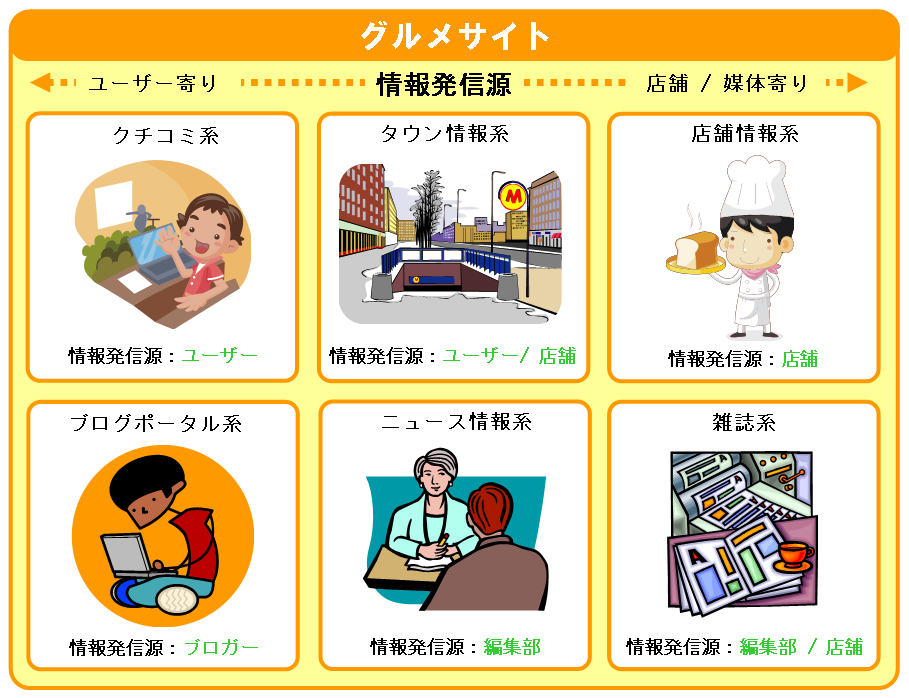 以下、パワーポイントの楽しいクリップアートを駆使しながら、「グルメサイト」のジャンル分けを図にしてみました (あくまで個人の主観です)。