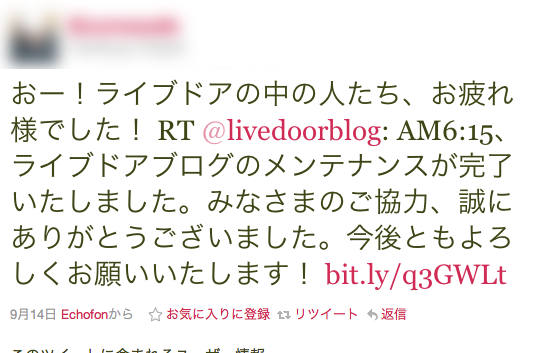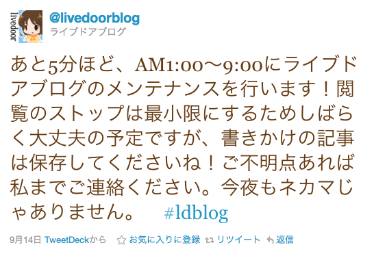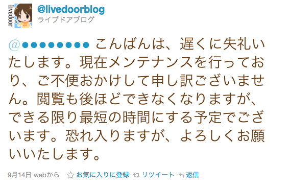 以前、livedoor Blogで深夜メンテナンスを実施した際は、AM1:00〜7:00頃まで張り付きでツイートをしました。メンテナンス告知を見ていなかったユーザーも多く、100人以上にアクティブサポートを行い、不安・不満の解消に役立つことができました。