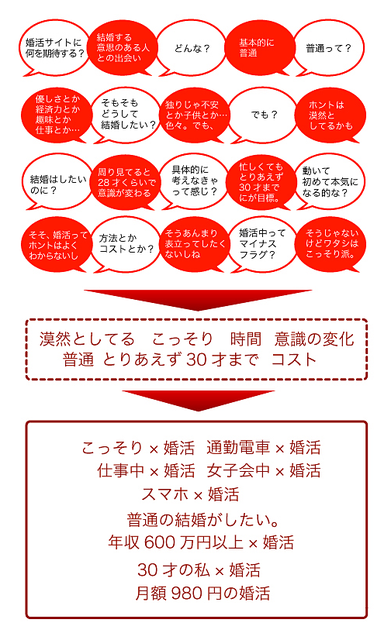 当事者意識を喚起する「刺さるもの」、本質的な興味、欲求をイメージさせるものをあぶり出すために私たちは制作前にブレークダウンのブレストをします。ちょっとした言葉を何度か分解しながらキーワードを探します。